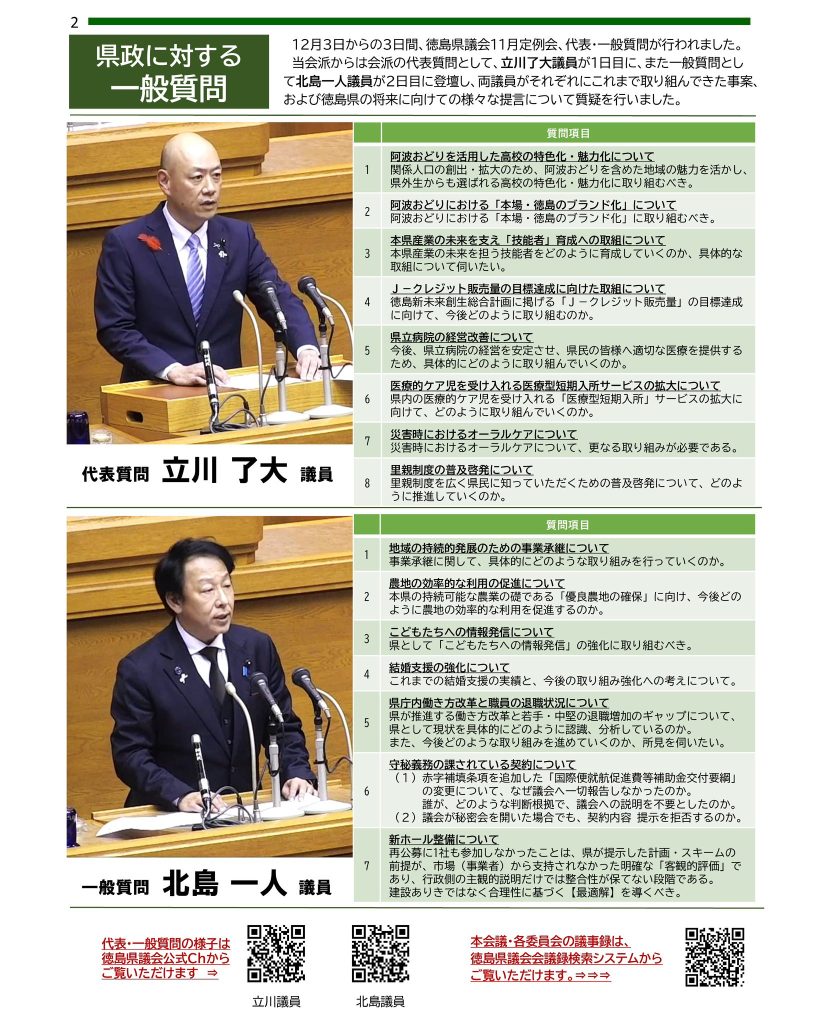 今定例会において、会派の代表質問に立川了大議員、一般質問に北島一人議員